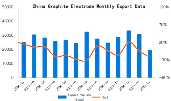 According to customs data, the export volume of graphite electrodes from China in February 2025 was 19,400 tons, a decrease of 36.39% compared to the previous month and a decrease of 22.34% compared to the same period last year. The total export volume of graphite electrodes from China in January and February 2025 was 50,000 tons, a decrease of 12.33% compared to the same period last year. The major export countries for Chinese graphite electrodes in February 2025 were South Korea, Russia, and India.