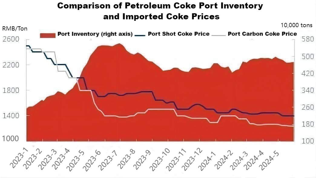 In June, approximately 1 million tons of imported coke are planned to arrive and be stored, predominantly consisting of high-sulfur coke, with the majority expected to be stored at ports in Shandong and South China. The “2024-2025 Energy Conservation and Carbon Reduction Action Plan” has prompted cautious procurement attitudes from end-users such as power plants and cement factories, negatively impacting the sales of high-sulfur fuel-grade imported coke, and exerting downward pressure on fuel-grade petroleum coke prices.