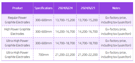 As of June 24, 2024, the market prices for regular, high power, and ultra-high power graphite electrodes range from 13,700 to 22,200 yuan/ton, remaining stable compared to the previous workday. The average price for graphite electrodes is 15,326 yuan/ton, with the market maintaining a steady trend. Graphite electrode production continues at a stable pace, with limited downstream demand, prioritizing a balance between production and sales. Despite a cautious trading atmosphere, actual transaction prices may fluctuate, and some companies, due to sufficient order reserves, show slight price increase intentions. Overall, the graphite electrode market remains stable with minor fluctuations. Current price ranges are as follows: for 300-600mm diameter graphite electrodes, regular power is priced at 13,700-15,200 yuan/ton, high power at 14,200-16,700 yuan/ton, and ultra-high power at 14,700-18,700 yuan/ton; for 700mm diameter ultra-high power graphite electrodes, the price ranges from 21,200 to 22,200 yuan/ton.