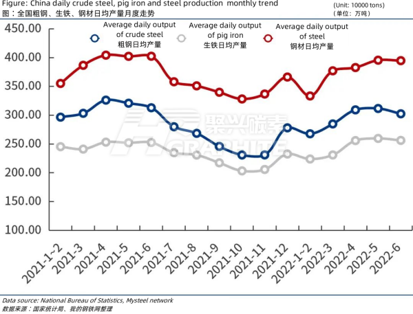 In June 2022, the average daily output of steel bars, medium thickness steel strips and other products was 669000 tons and 565000 tons, down 37000 tons and 6000 tons respectively from the previous month; The average daily output of steel wire, cold rolled sheet and welded steel pipe was 435000 tons, 126000 tons and 176000 tons, an increase of 3000 tons, 5000 tons and 2000 tons respectively from the previous month. With the further expansion of production reduction in July, the daily average output of major steel varieties is expected to continue to decline.