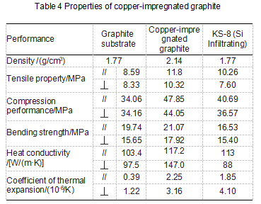 (b) Metal impregnation: Metal impregnated graphite can maintain the advantages of both. Commonly used impregnated metals are antimony, silver, lead, copper, etc. The physical properties of antimony-impregnated graphite materials have been tested abroad. The related research is shown in Table 2.